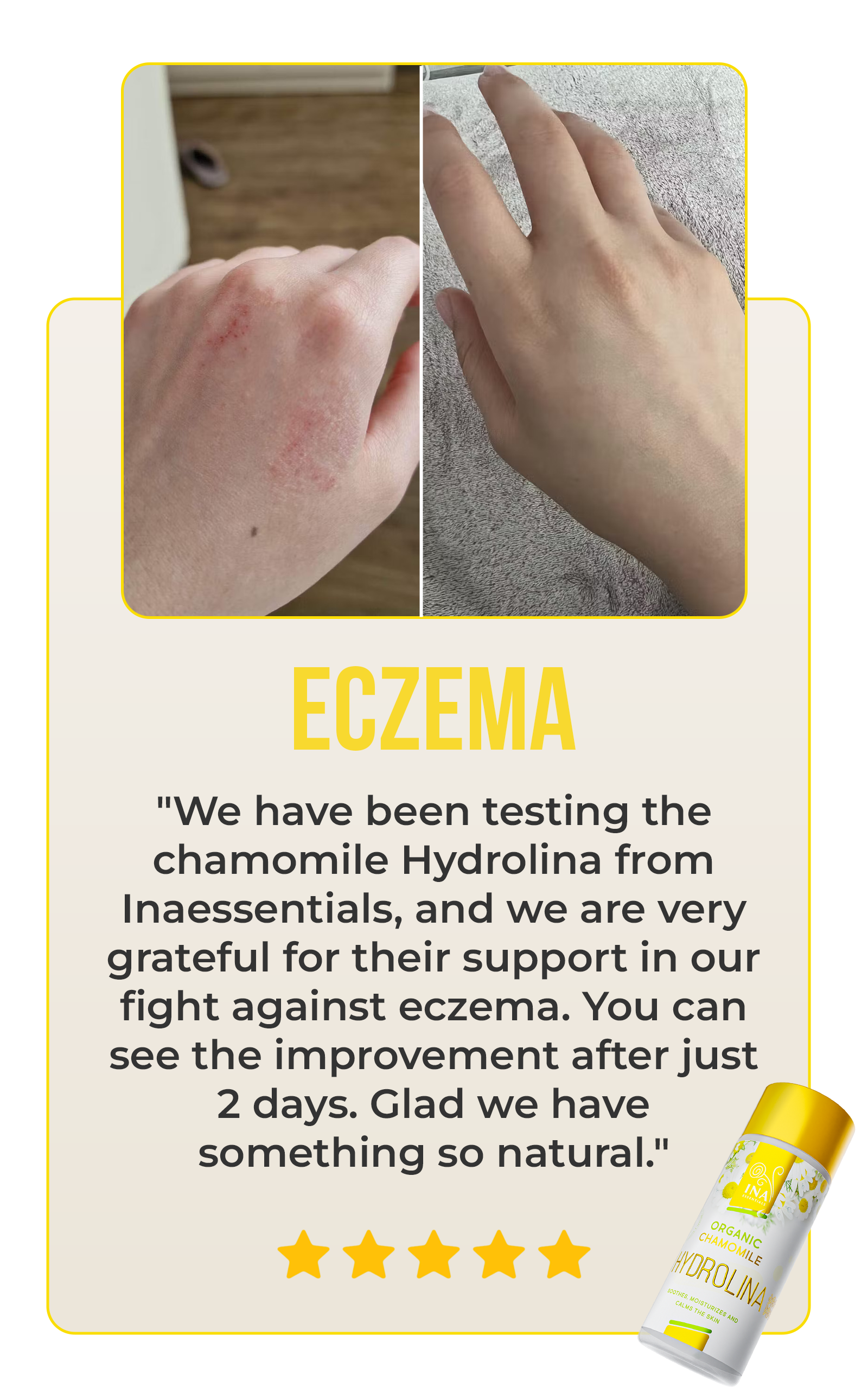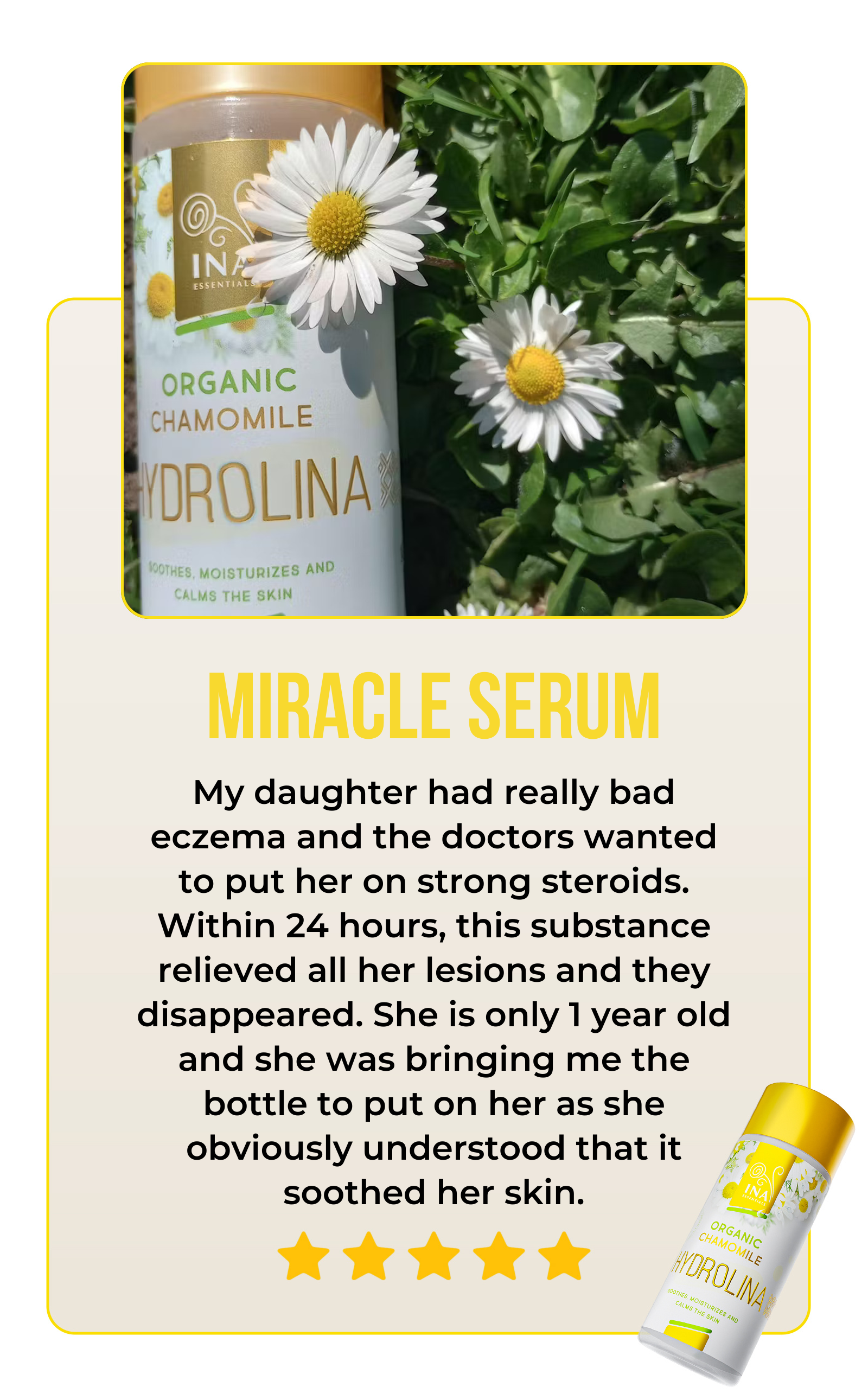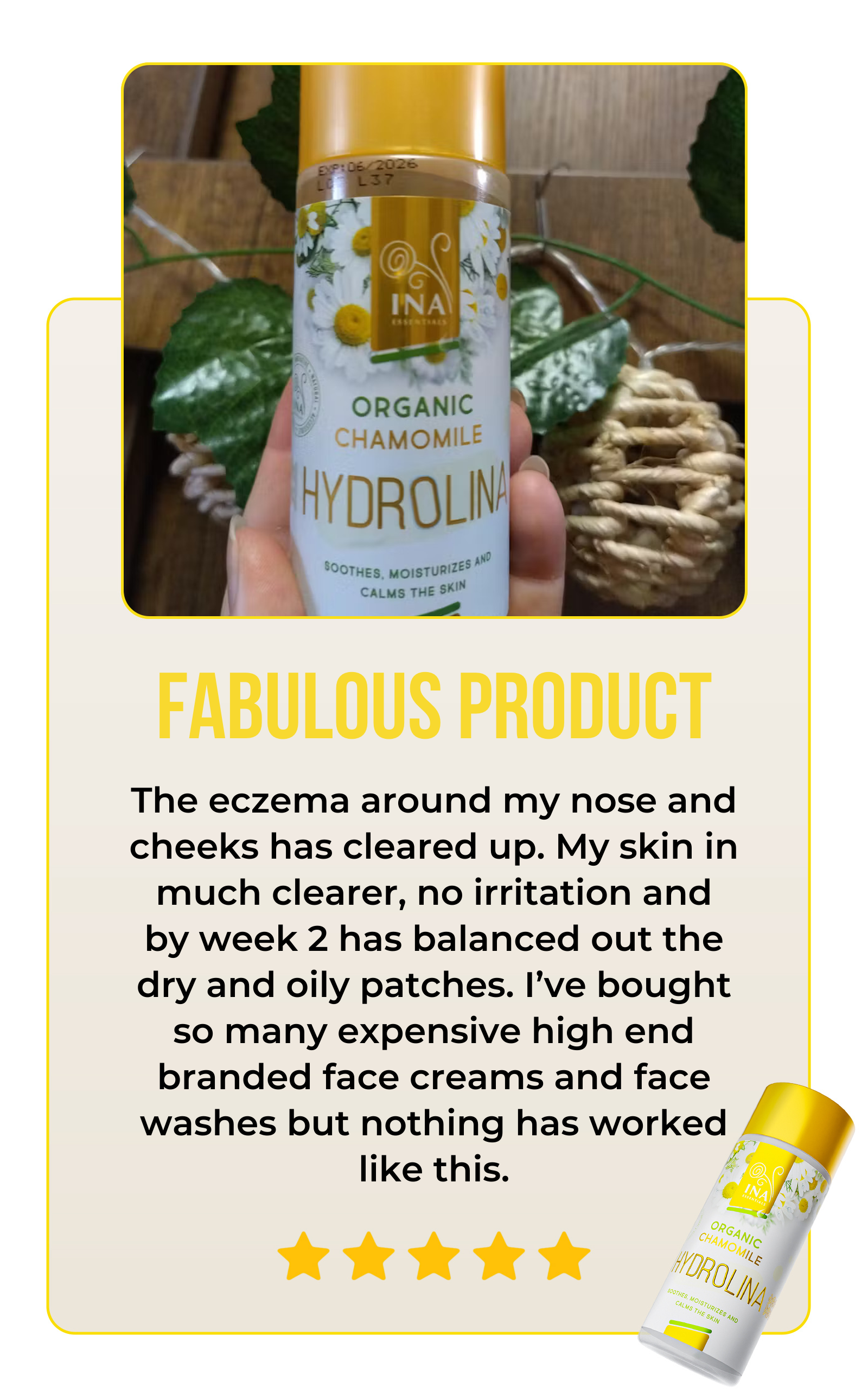 Organic Chamomile Hydrolina (150ml) is more than just a gorgeous bottle, it's fortified by real customer testimonials. With an impressive customer satisfaction score of over 90%, our product shows its effectiveness in soothing eczema, rashes, and skin irritations while enhancing your skin's health. Don't just take our word for it, read our customers' stories.