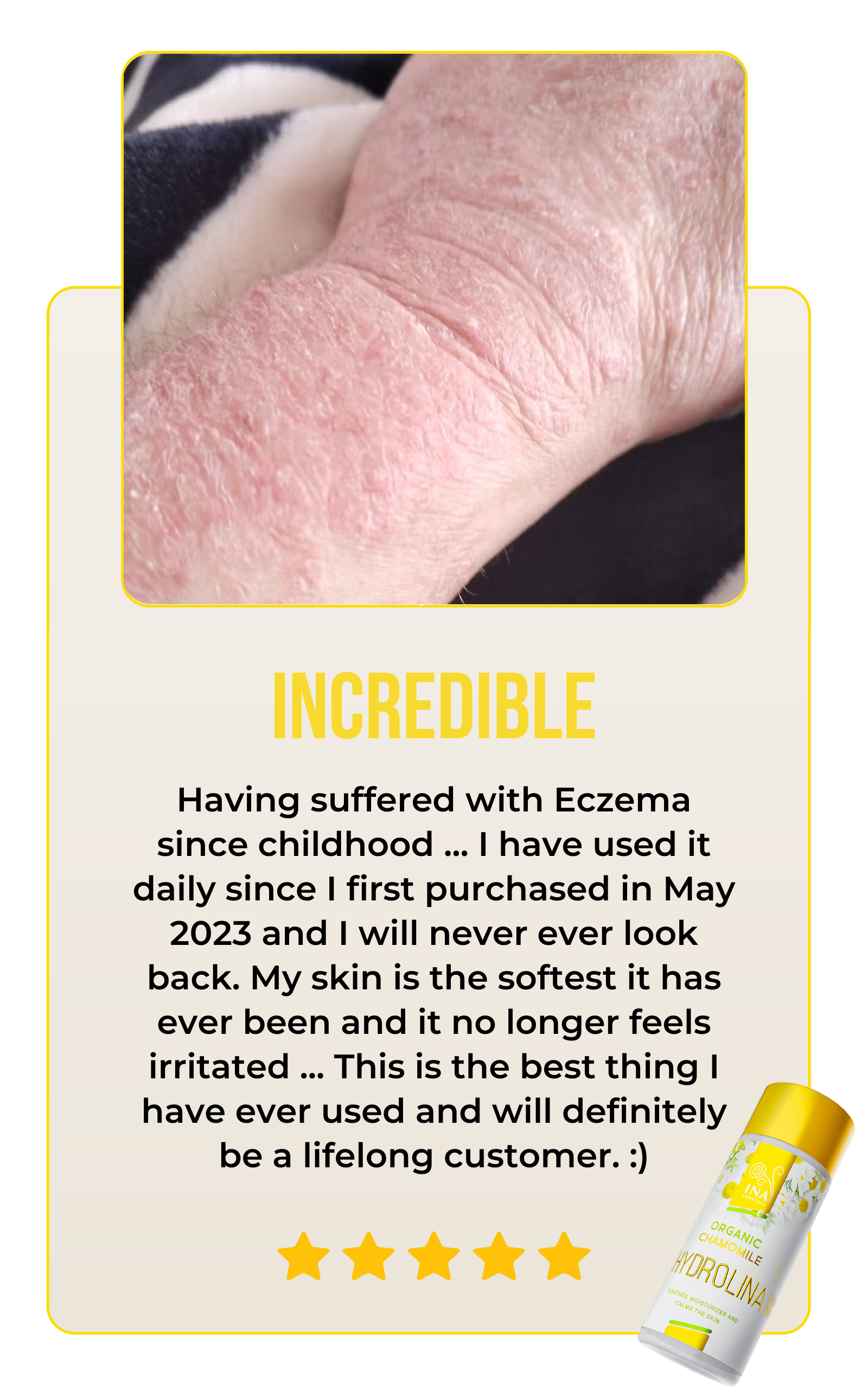 In just four years, Chamomile Hydrolina has become a favourite eczema solution, with over 100,000 bottles delivered worldwide. The pride we take in our low return rate (below 1% ) validates our dedication to quality and customer satisfaction.